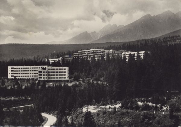Wyżnie Hagi. Sanatorium przeciwgruźlicze i jego otoczenie. Na pierwszym planie serpentyny drogi dojazdowej. W tle szczyty Tatr Wysokich.