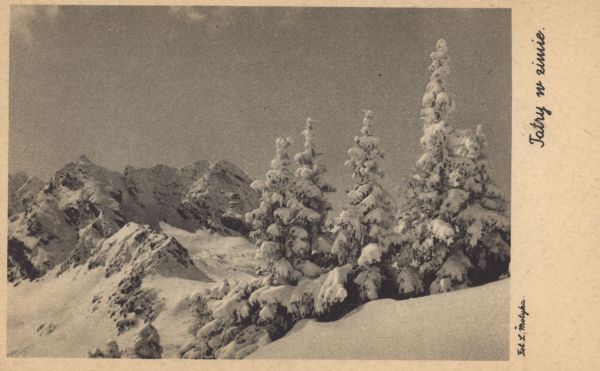 Dolina Gąsienicowa w zimowej scenerii. W tle Kościelec i Świnica. Na marginesie wydrukowany tytuł i nazwisko fotografa.