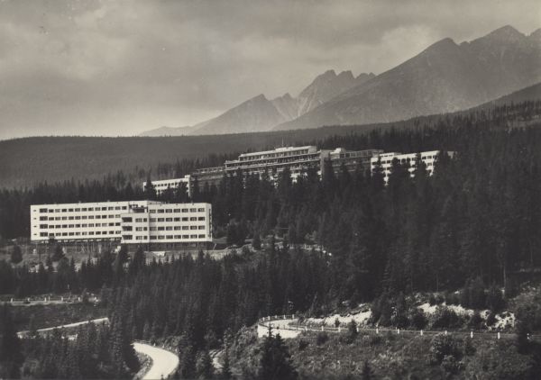 Wyżnie Hagi. Sanatorium przeciwgruźlicze i jego otoczenie. Na pierwszym planie serpentyny drogi dojazdowej. W tle szczyty Tatr Wysokich.