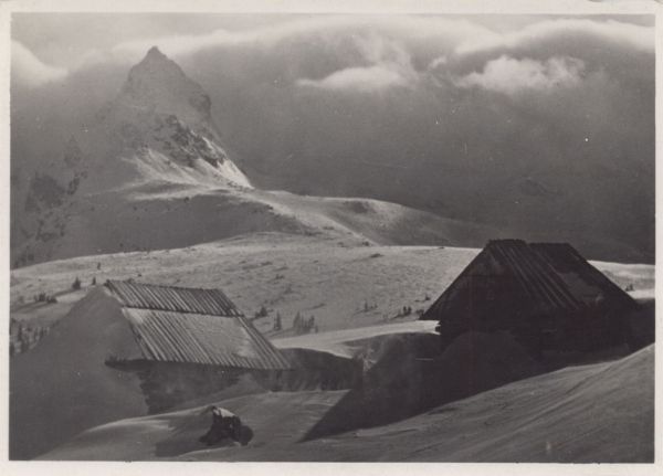 Śnieżyca nad Kościelcem. Na pierwszym planie szałasy pasterskie na Hali Gąsienicowej.