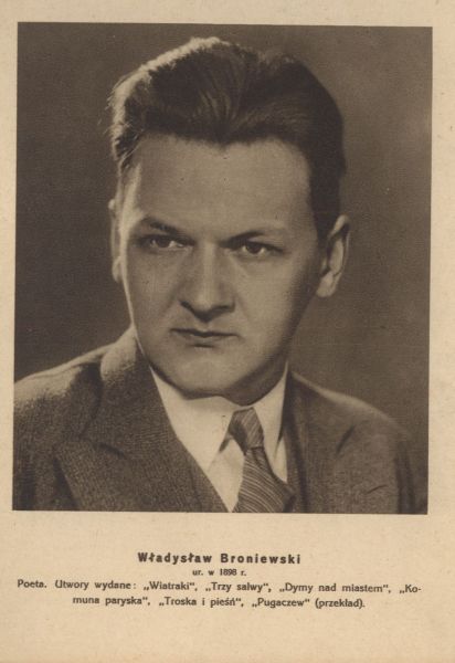 WSPÓŁCZEŚNI PISARZE POLSCY. Władysław Broniewski ur. w 1898 r. Poeta. Utwory wydane: "Wiatraki", "Trzy salwy", "Dymy nad miastem", "Komuna paryska", "Troska i pieśń", "Pugaczew" (przekład).