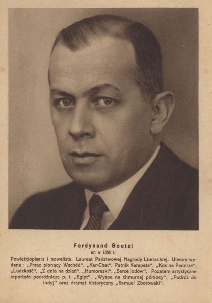WSPÓŁCZEŚNI PISARZE POLSCY. Ferdynand Goetel ur. w 1890 r. Powieściopisarz i nowelista. Laureat Państwowej Nagrody Literackiej. Utwory wydane: "Przez płonący Wschód", "Kar-Chat", "Pątnik Karapeta", "Kos na Pamirze", "Ludzkość, "Z dnia na dzień", "Humoreski", "Serce lodów". Pozatem artystyczne reportaże podróżnicze p.t. "Egipt", "Wyspa na chmurnej północy", "Podróż do Indyj" oraz dramat historyczny "Samuel Zborowski".