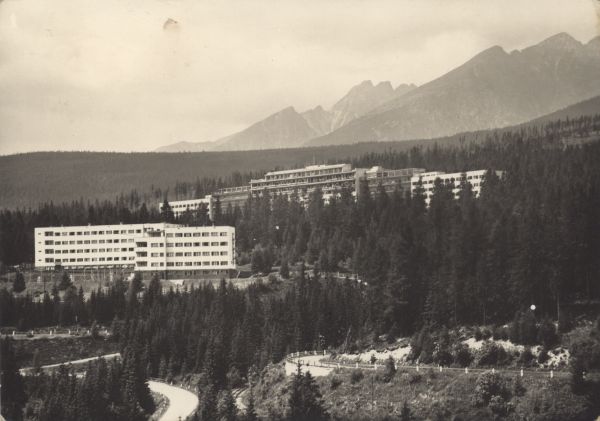 Wyżnie Hagi. Sanatorium przeciwgruźlicze i jego otoczenie. Na pierwszym planie serpentyny drogi dojazdowej. W tle szczyty Tatr Wysokich.