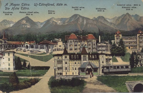 Zabudowania Nowego Smokowca. W tle: Kończysta, Gerlach, Staroleśny Szczyt, Sławkowski Szczyt, Pośrednia Grań, Łomnica i Kieżmarski Szczyt. U góry wydrukowany tytuł, również w języku niemieckim oraz nazwy i wysokości szczytów.