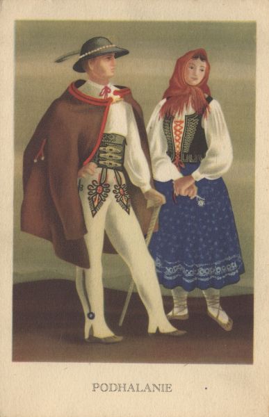 PODHALANIE. POLSKIE STROJE LUDOWE. Z oryginałów w Muzeum Kultur Ludowych w Młocinach malował Aleksander M. Haupt.