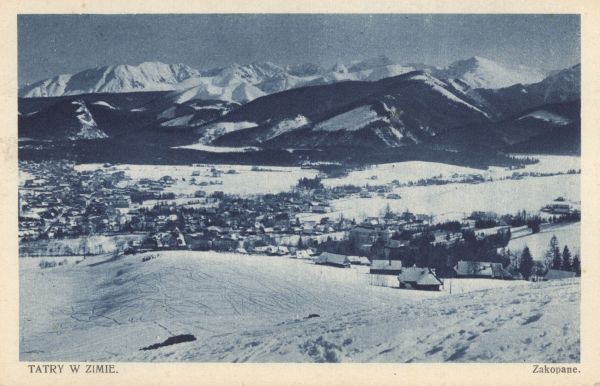 Widok ogólny na Zakopane z Gubałówki w zimie. Pod zdjęciem drukowany tytuł.