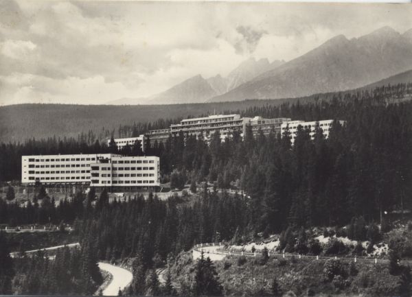 Wyżnie Hagi. Sanatorium przeciwgruźlicze i jego otoczenie. Na pierwszym planie serpentyny drogi dojazdowej. W tle szczyty Tatr Wysokich.