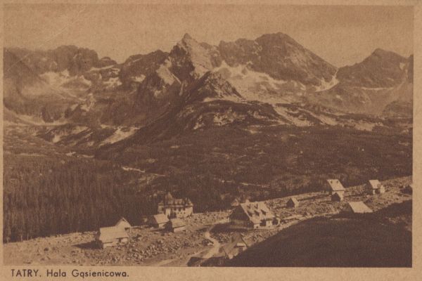 Schronisko Murowaniec i szałasy na Hali Gąsienicowej. W tle Kozi Wierch, Kościelec i Świnica. Pod zdjęciem drukowany tytuł.