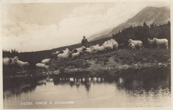 Owce z juhasem nad stawem w Tatrach. Na dole tytuł.