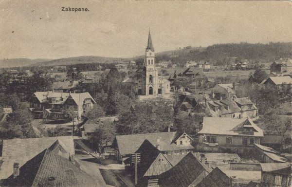 Widok ogólny na Zakopane z wieży straży pożarnej. W dole ul. Kościeliska. Pośrodku Nowy Kościół. U góry drukowany tytuł.