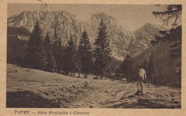 Widok na Giewont z Hali Strążyskiej. Na pierwszym planie góral. Pod zdjęciem drukowany tytuł.