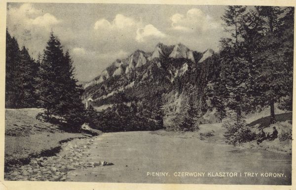 Widok na Trzy Korony z Czerwonego Klasztoru. Na dole tytuł.