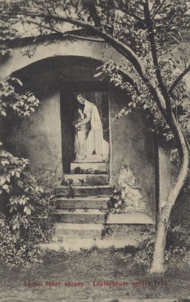 Portret Białej Damy (Julia Geci-Korponay) na Zamku w Lewoczy. Na dole drukowany tytuł, również w języku niemieckim.