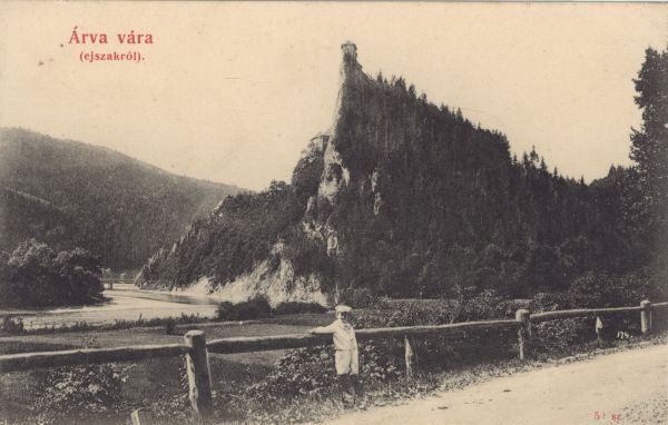 Widok na Zamek Orawski. Na pierwszym planie stoi chłopiec. W dole płynie rzeka Orawa. U góry drukowany tytuł.