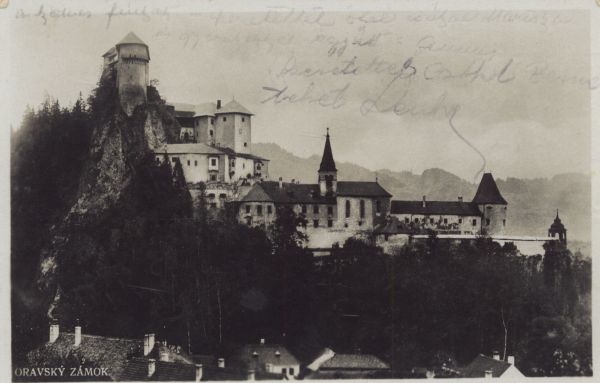 Widok na Zamek Orawski. W dole zabudowania Orawskiego Podzamcza. Na dole tytuł.
