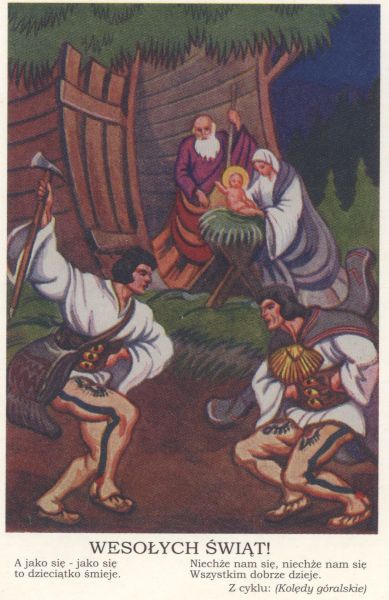 W. Boratyński mal. Wesołych Świąt. A jako się - jako się to dzieciątko śmieje. Niechże nam się, niechże nam się Wszystkim dobrze dzieje. Z cyklu: (Kolędy góralskie). Ze zbiorów Muzeum Tatrzańskiego w Zakopanem.