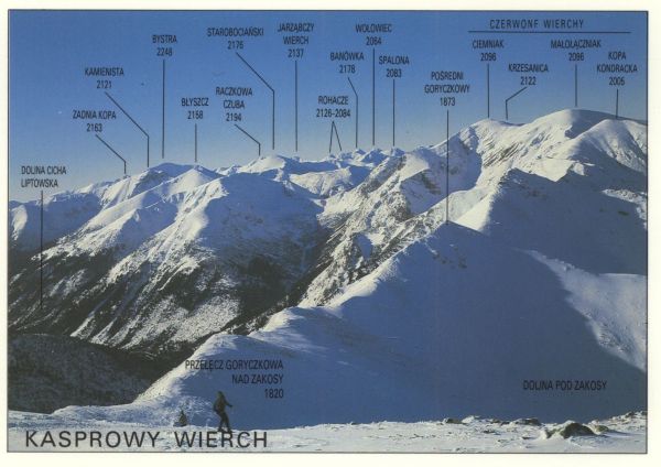 Widok z Kasprowego Wierchu na zachód. W tle Tatry Zachodnie. Na zdjęciu nadrukowane nazwy topograficzne i wysokości szczytów.