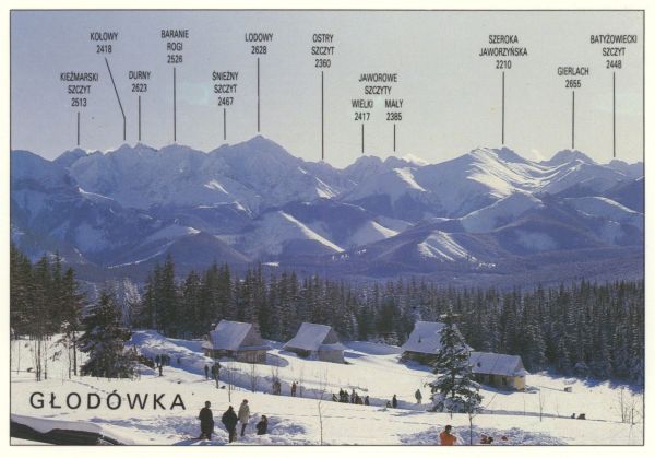 Panorama Tatr Wysokich z Głodówki w zimie. Na pierwszym planie zabudowania wiejskie i turyści. Na zdjęciu nadrukowane nazwy topograficzne i wysokości szczytów.