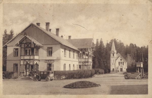 Tatrzańska Kotlina. Willa Zielony Staw, kościół, sklep. W tle las.