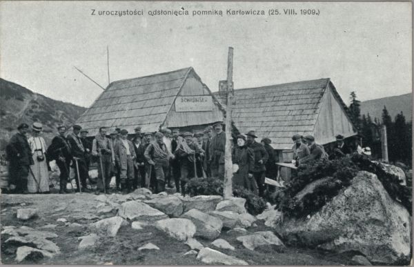 Z uroczysto¶ci odsłonięcia pomnika Karłowicza (25.VIII.1909). Uczestnicy uroczysto¶ci zgromadzeni na Hali G±sienicowej przed schroniskiem Tow. Tatrzańskiego.