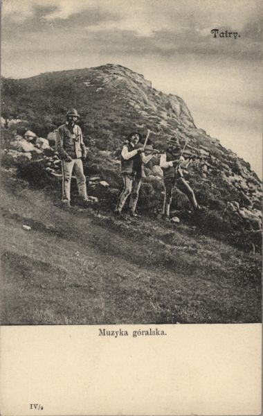 Górale grający na skrzypcach. Pod zdjęciem drukowany tytuł.