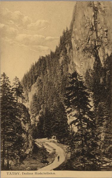 Turysta na szlaku w Dolinie Kościeliskiej. Pod zdjęciem drukowany tytuł.