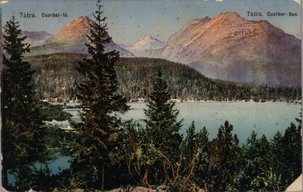 Szczyrbskie Jezioro. W tle Solisko, Szczyrbski Szczyt i Skrajna Baszta. U góry wydrukowany tytuł, również w języku niemieckim.