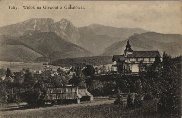 Kościół OO. Jezuitów na Górce w Zakopanem. W tle Giewont. U góry drukowany tytuł.
