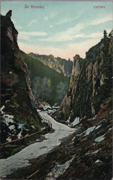 Dolina Za Bramką. W głębi widoczna altana Towarzystwa Tatrzańskiego. U góry wydrukowany tytuł.