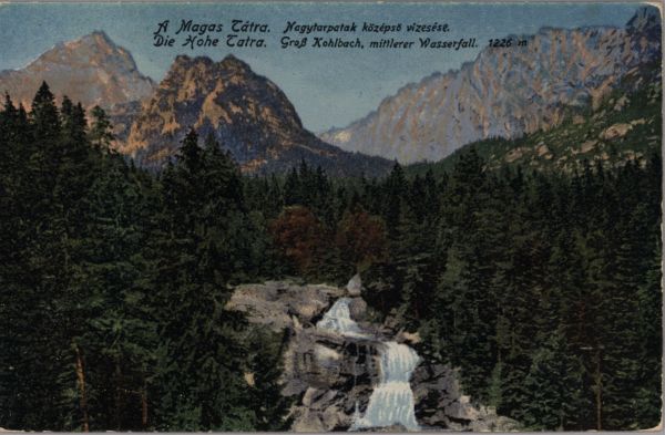 Wielki Wodospad Zimnej Wody. W tle Pośrednia Grań z lewej, Łomnica z prawej. U góry wydrukowany tytuł, również w języku niemieckim.