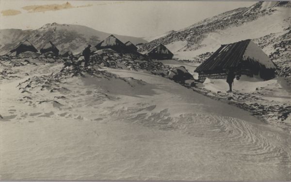 Tury¶ci obok szałasów na Hali G±sienicowej w zimie.