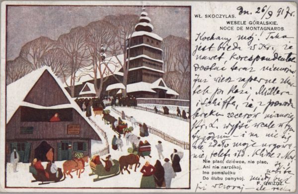 Reprodukcja obrazu Władysława Skoczylasa pt. Wesele góralskie. Po prawej stronie wydrukowany tytuł, również w języku francuskim. Korespondencja.