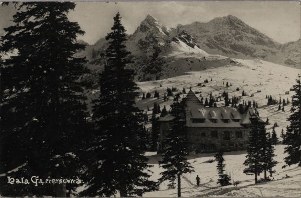 Schronisko Murowaniec na Hali G±sienicowej w zimie. W tle Ko¶cielec i ¦winica. Na dole wpisany tytuł.