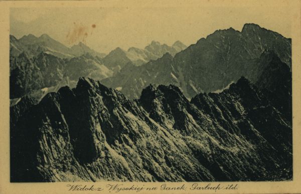 Widok z Wysokiej na południowy wschód. Na pierwszym planie Ganek, w tle z prawej Gerlach. Pod zdjęciem drukowany tytuł.