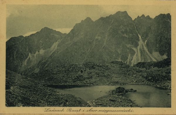 Wielki Żabi Staw Mięguszowiecki. W tle widoczna Grań Baszt. Pod zdjęciem drukowany tytuł.