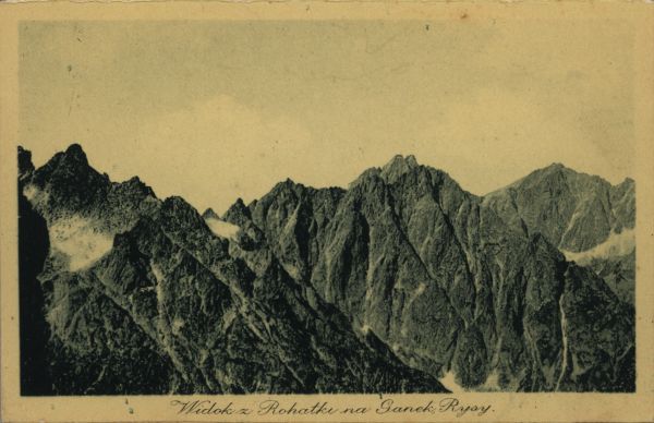 Widok z Rohatki na zachód. Pośrodku widoczny Ganek i Wysoka, z prawej w tle Rysy. Pod zdjęciem drukowany tytuł.