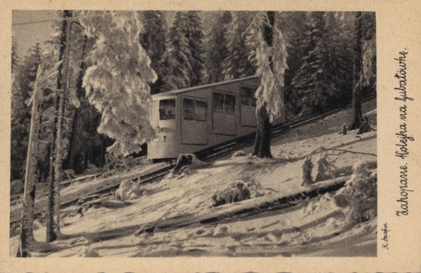 Wagon kolei linowo-terenowej na Gubałówkę w zimowej scenerii. Na marginesie drukowany tytuł i nazwisko fotografa.