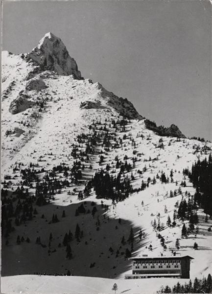 Hotel górski na Kalatówkach w zimie. W tle Giewont.