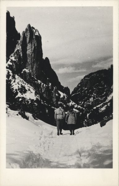 Turyści na szlaku w Dolinie Kościeliskiej w zimie. W tle Raptawicka Turnia.