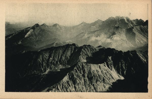 Widok z samolotu na Tatry Bielskie, grupę Łomnicy i Orlą Perć.
