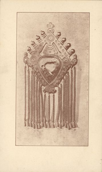 Podhale. Spinka do koszuli męskiej, mosiężna, ozdobnie wykonana z łańcuszkami u dołu.