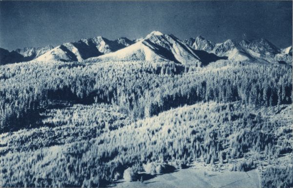 Panorama Tatr Wysokich od północy w zimie. Pośrodku Wołoszyn i Koszysta.