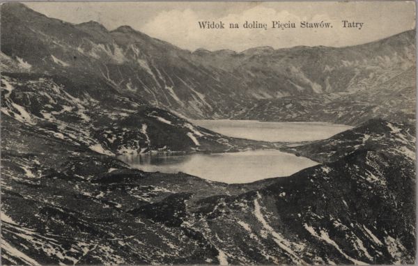 Widok do Doliny Pięciu Stawów Polskich ze Świstówki Roztockiej. W dole Wielki Staw Polski i Przedni Staw Polskie. W tle Liptowskie Mury. U góry wydrukowany tytuł.
