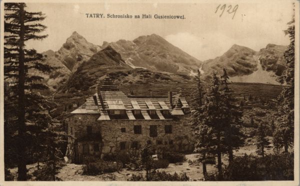 Schronisko Murowaniec na Hali Gąsienicowej. W tle Kościelec i Świnica. U góry wydrukowany tytuł.
