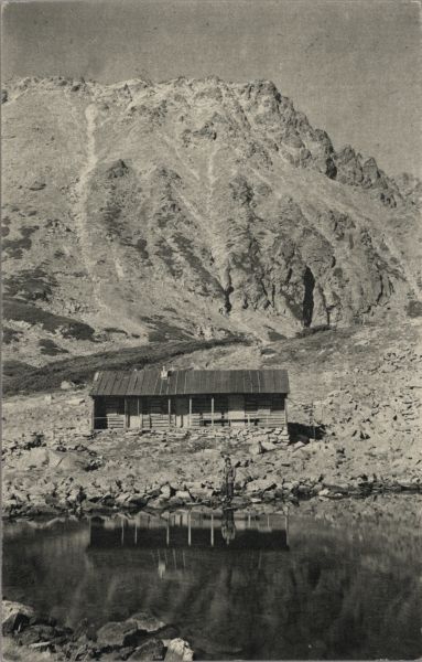 Schronisko w Dolinie Pięciu Stawów Polskich. Nad Małym Stawem Polskim stoi turysta. W tle Kozi Wierch.