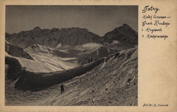 Narciarz i turyści na Kasprowym Wierchu w zimie. W tle Grań Hrubego i Krywań. Na marginesie wydrukowany tytuł i nazwisko fotografa.