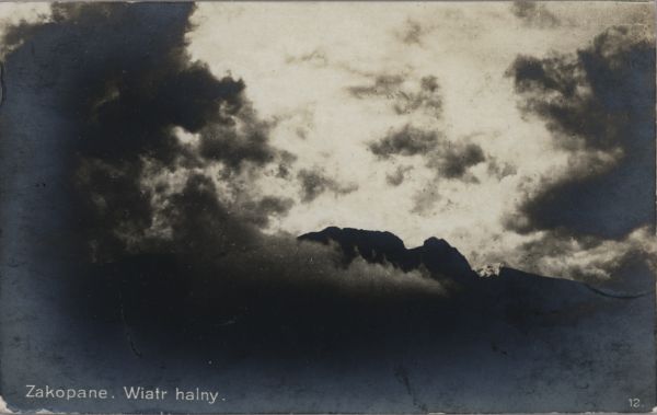 Widok na Giewont podczas wiatru halnego. Na dole wpisany tytuł.