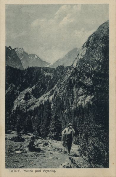 Dwoje taterników na Polanie pod Wysoką. W tle szczyty nad Doliną Kaczą. Pod zdjęciem drukowany tytuł.