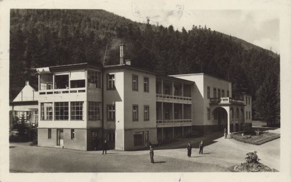 Widok na sanatorium w Tatrzańskiej Kotlinie. Budynek reprezentacyjny: Kasyno. Przed obiektem kilku kuracjuszy. W tle las.