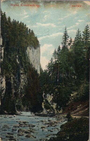 Pośrednia Kościeliska Brama w Dolinie Kocieliskiej. W dole płynie Kościeliski Potok. U góry drukowany tytuł.